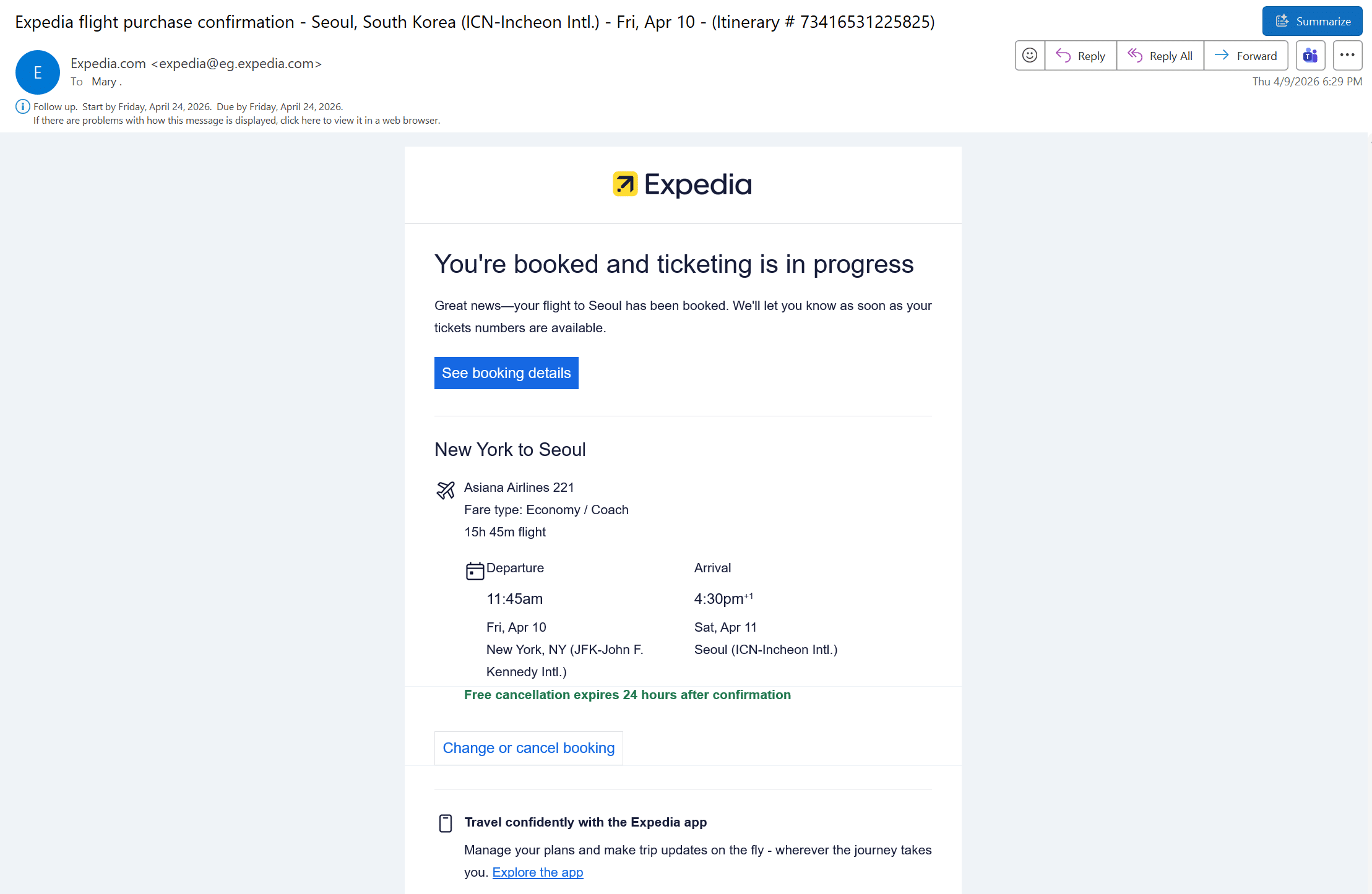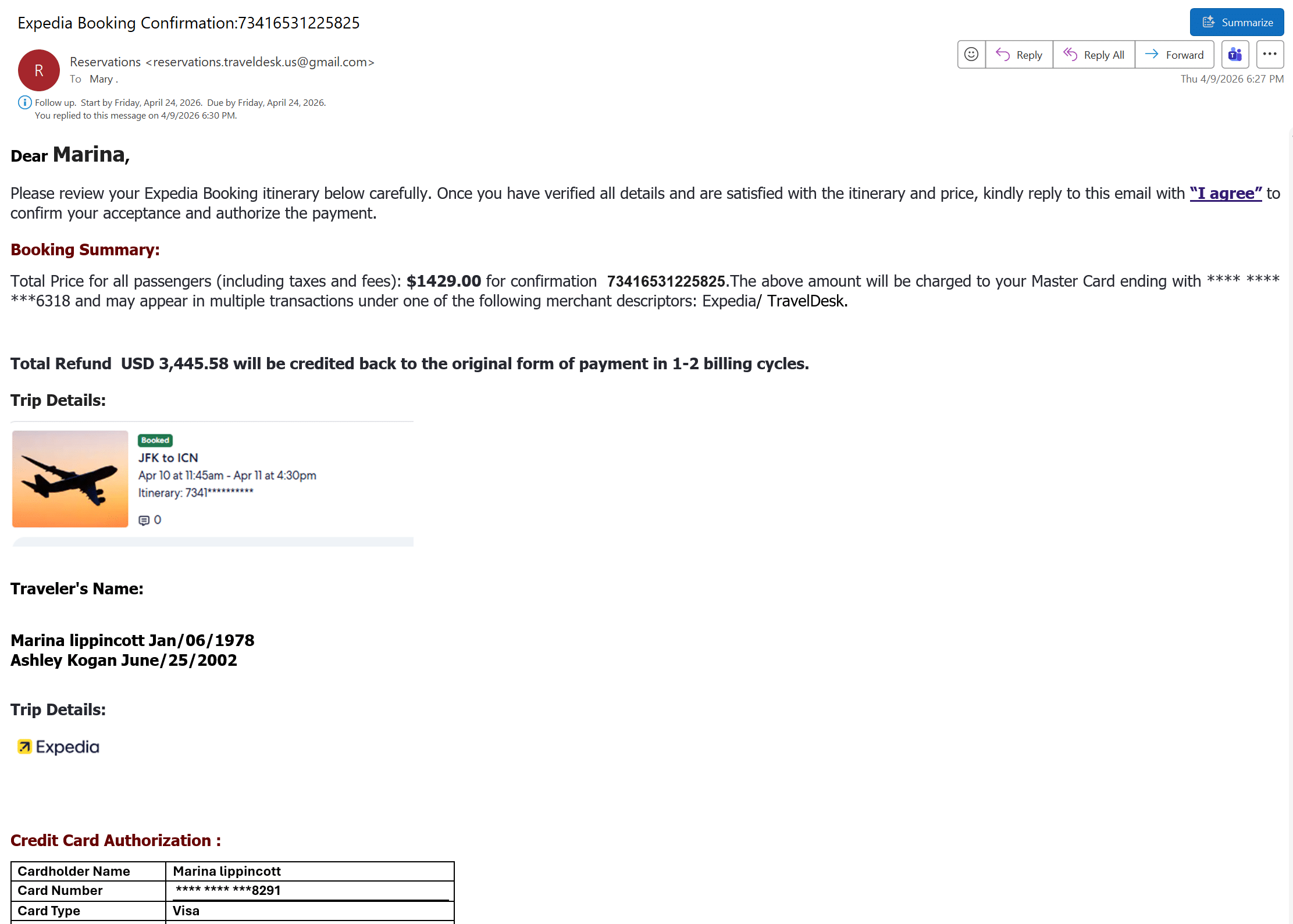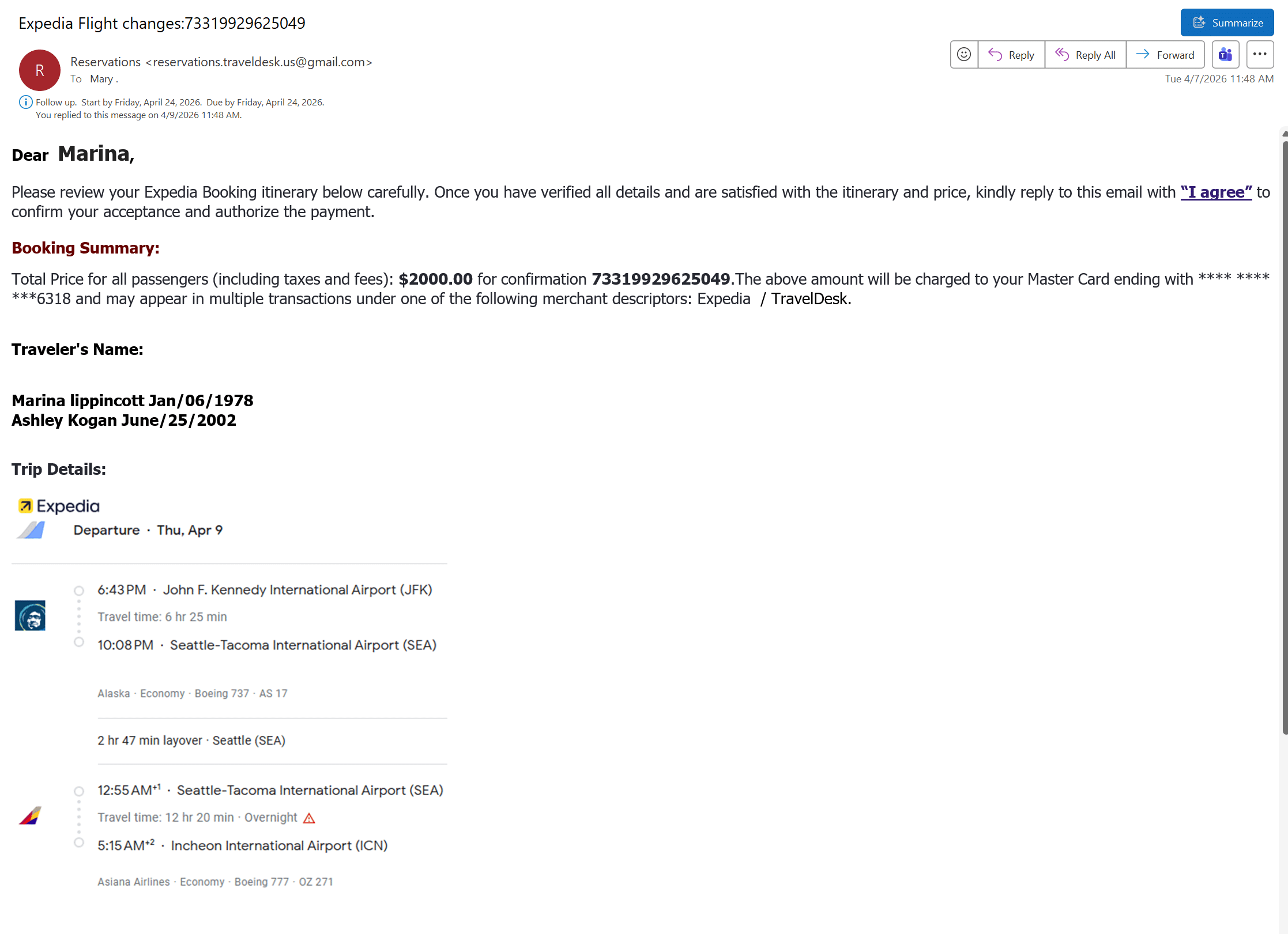 On December 5, 2025, I was doing something different. I was planning a trip to Korea with my daughter Ashley. Visiting Korea had been a lifelong dream of Ashley’s, and I wanted to share that experience with her as a gift. So I sat down with my coffee, opened Expedia, and booked round-trip tickets on Asiana Airlines from JFK to Incheon for the two of us. Two passengers, four months out, $2,692.66 on a Visa I’d used for everything for years. The outbound was OZ221, scheduled for 1:00 PM departure from JFK on April 9, 2026.
