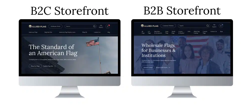 Allied Flag’s biggest problem wasn’t that their sites looked outdated — it was that they looked unrelated. A customer browsing the B2C store had no idea the same company ran a commercial wholesale operation, and B2B buyers couldn’t see the consumer side either. They knew this brand disconnect was costing them. Cross-selling opportunities were slipping through the cracks, and their overall market presence felt scattered when it should’ve been unified and strong. Beyond the branding issue, each storefront had its own content challenges. The B2C website needed educational content to attract new customers and drive organic traffic, but it wasn’t showcasing their expertise. The B2B website needed the opposite, streamlined access to products and pricing without unnecessary content, since commercial buyers already know what they want. Both storefronts required completely different approaches, but first, they needed to look and feel like the same company.