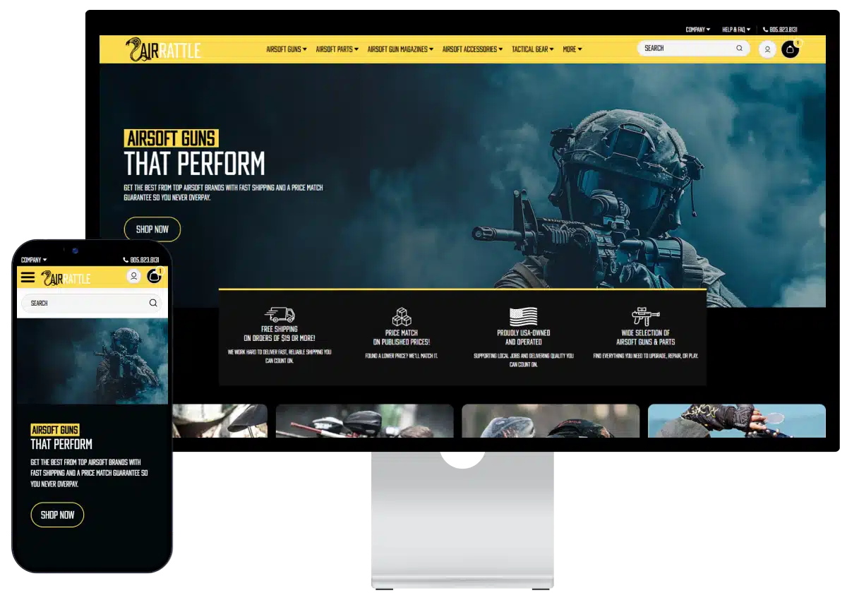 AirRattle.com is a trusted retailer specializing in airsoft guns, attachments, and accessories. While the brand had built strong credibility in the airsoft community, their BigCommerce site didn’t reflect it. Outdated design, unclear navigation, and cut-off homepage banners made browsing frustrating and caused shoppers to leave before buying.